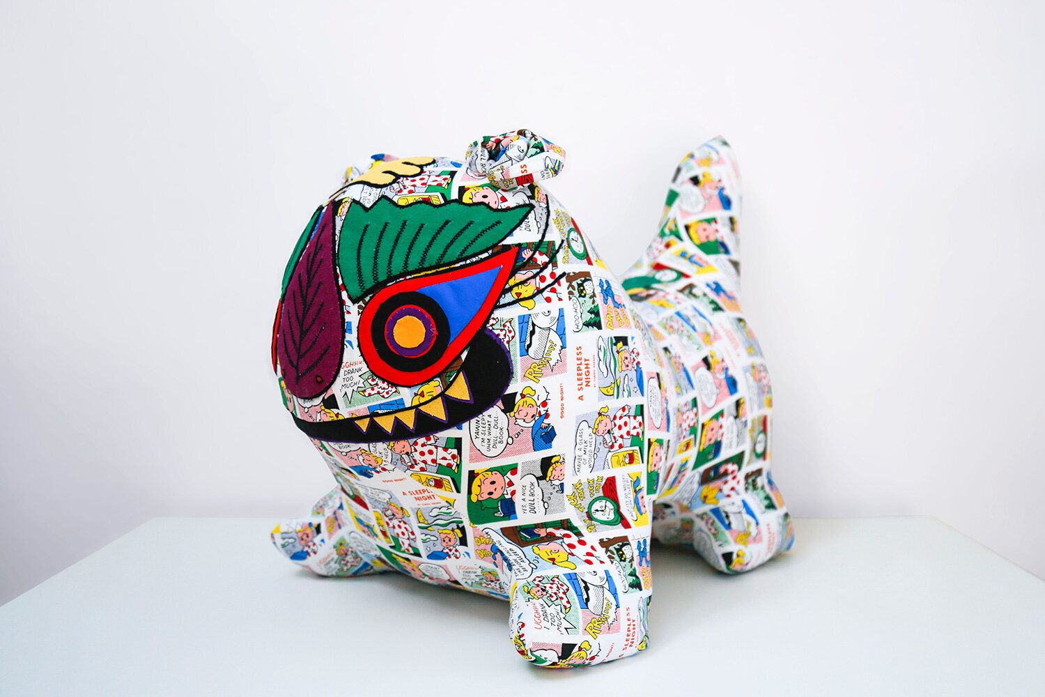 The soft sculptures of the ‘Tigress’ series are the artist’s personal interpretation of traditional Chinese tiger pillows that are widely given to babies as a toy, a token of love, a wish for a long life and to protect and guard the child. These pillows are all made by hand, usually by members of the family. Ming Lu’s works transcend the routine fabric pattern of the toys; the contents of the tigress’ bodies – that have a connection to the artist childhood in the 90‘s in China – convey a sense of nostalgia. The artist owned one herself and lost it when she was young.